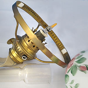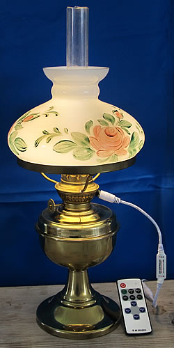 Eine echte Petroleumlampe wurde zu einer fernsteuerbaren LED-Leuchte umgebaut. Zu sehen ist der 12 V-Netzstecker-Trafo, der kleine, schmale Dimmer und die praktische Fernbedienung. Mit ihr kann die Helligkeit mehrstufig (10, 20, 40, 60, 80, 100%) eingestellt werden.
