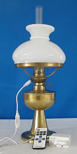 Diese echte Messing-Petroleumlampe, etwa aus den 40er Jahren, habe ich zu einer fernsteuerbaren LED-Leuchte umgebaut. Im Vordergrund der 12 V-Netzstecker-Trafo, der kleine, schmale Dimmer und die praktische Fernbedienung. Mit ihr ist die Helligkeit mehrstufig von 0 auf 100% einstellbar.